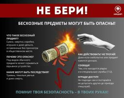 Помните! Бесхозная вещь — не просто находка, а потенциальная угроза жизни и здоровью. Не прикасайся к свёрткам, коробкам, проводам и другим подозрительным предметам. Если что-то заметил, отойди не менее чем на 30 метров, предупреди других и позвони 112.